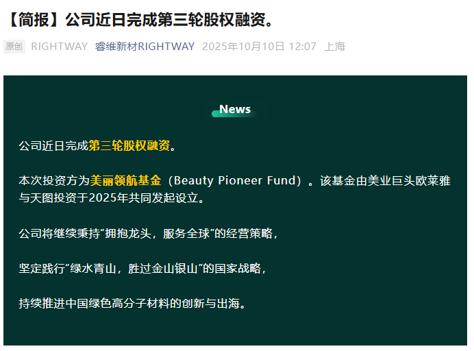 近期,浙江睿维新材料科技有限公司(简称“睿维新材”)宣布完成第三轮融资,投资方为美丽领航基金——该基金由欧莱雅与天图投资于今年共同发起成立。这也是欧莱雅首次投资中国本土包材企业。