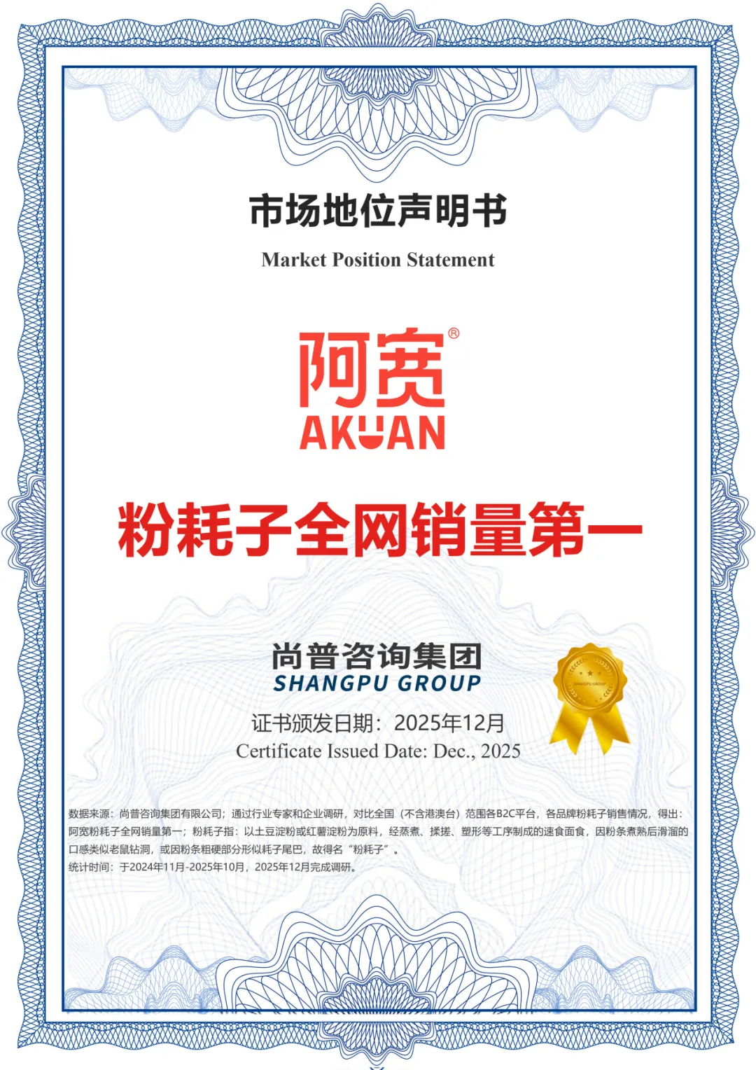 阿宽食品创新产品“一根粉耗子”以年销售额破亿的成绩,获得权威机构尚普咨询认证的“粉耗子全网销量第一” 称号,成为细分品类的领跑者。