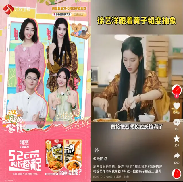 为了进一步扩大粉耗子的知名度,阿宽食品还通过跨界合作提升品牌影响力。粉耗子成为热门综艺《温暖的客栈》节目指定合作产品,通过明星食用场景深化“便捷美食”形象。