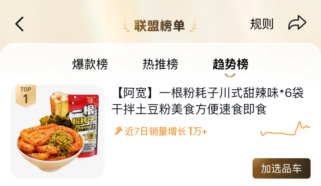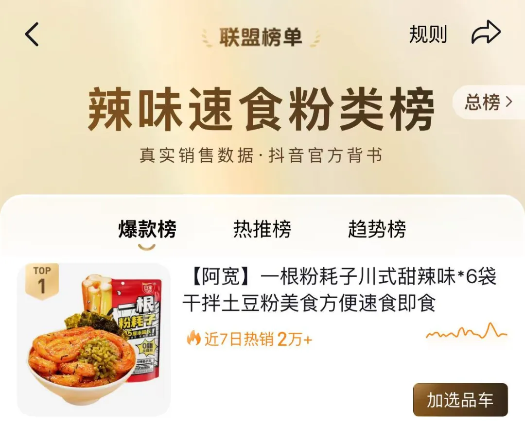 一根粉耗子荣登抖音辣味速食粉类爆款榜、趋势榜双榜榜首