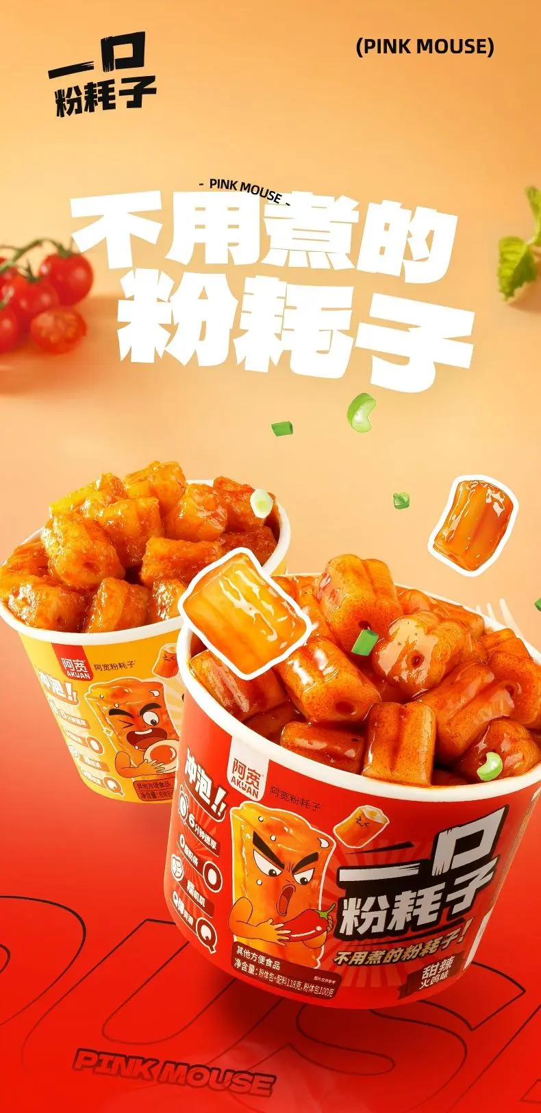 一口粉耗子在便捷性上有了更好的提升,冲泡即食,一口一个;在口味上又新增了当下流行的甜辣火鸡味,进一步拓展了粉耗子的消费场景、满足不同人群的需求与体验。