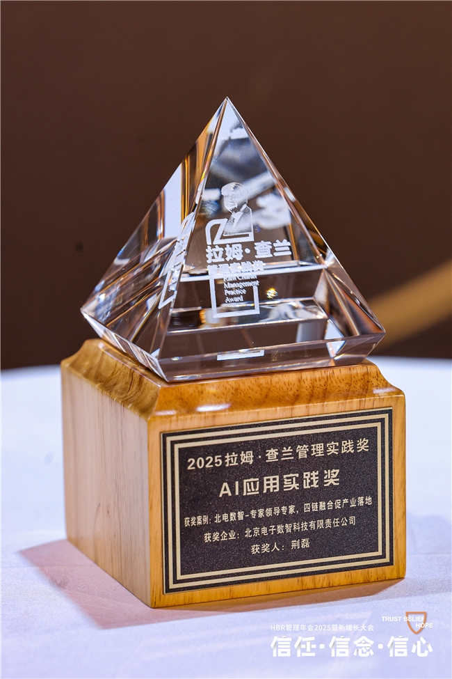 在今年《哈佛商业评论》管理年会2025暨新增长大会现场,北电数智凭借“专家领导专家”人才管理战略,以“产业链、创新链、人才链、资本链”四链融合促AI产业落地的创新实践,获得“AI应用实践奖”。