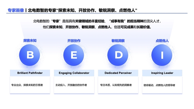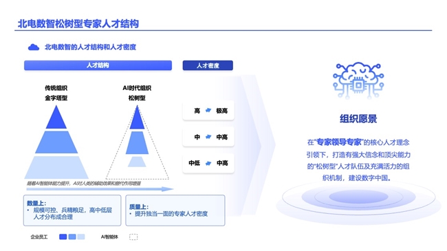 北电数智提出的“专家领导专家”模式,不强求所谓“全能型通才”,而是通过激活各垂直领域的专业人才,构建以专业影响力为纽带的协同机制,本质是“让专业的人主导专业的事”,让每个人的专业价值在共同的战略目标下实现最大化释放。