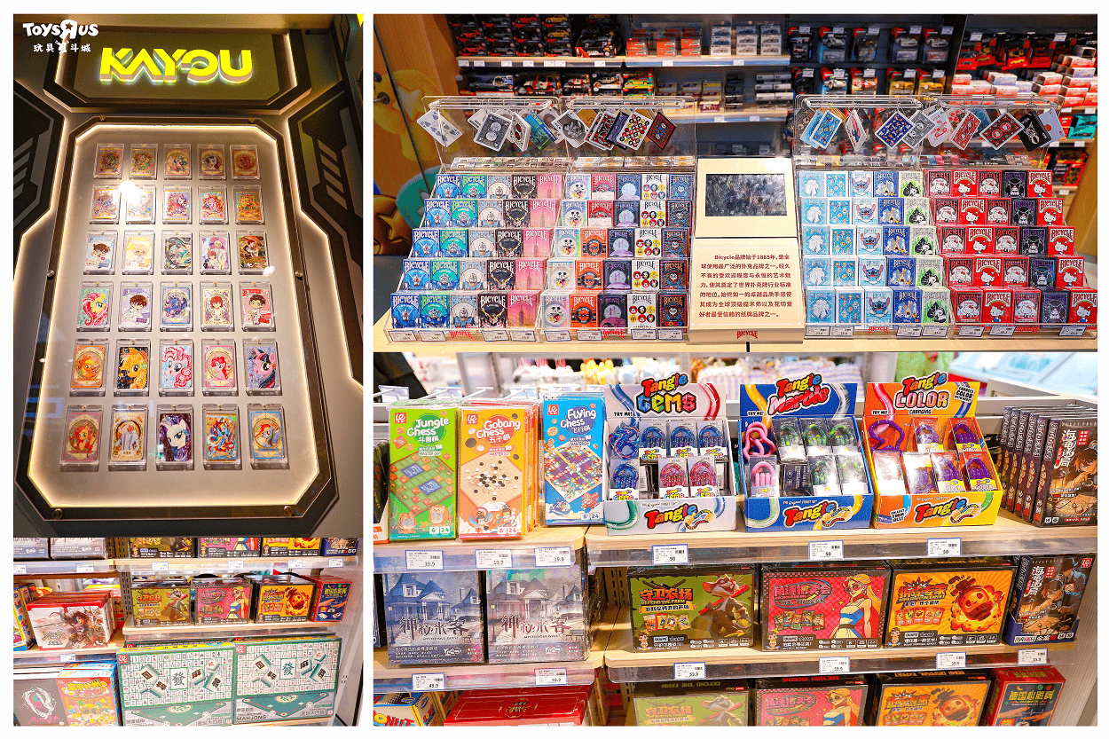 店内同样聚焦社交娱乐场景,精心打造一线卡牌与派对桌游矩阵,满足从收藏到聚会的多元需求。国际潮玩纸牌Bicycle全国首家线下体验中心亮相,带来50余款潮流纸牌,涵盖高达、三丽鸥、迪士尼多款IP,其中30余款为线下独家发售,为纸牌爱好者与收藏家提供稀缺选择。此外,店内汇集卡游旗下的热门IP系列,如《新世纪福音战士》、《奥特曼》、《蛋仔派对》、《第五人格》、《名侦探柯南》、《小马宝莉》等,为卡牌爱好者带来寻觅与集齐的深层愉悦。同时,精选大富翁、UNO牌、宝可梦系列、三国杀等经典派对桌游,为每一次聚会注入欢笑,成为年轻人休闲社交的灵感来源。
