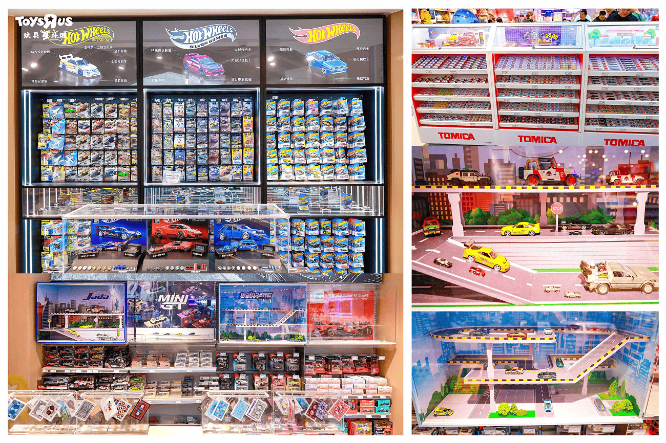 店内打造超级合金小车矩阵——入门级与收藏级小车的首选目的地。这里汇聚多美卡、多美卡TLV、风火轮、火柴盒、MINI GT、比美高、美驰图、美捷轮、JADA等国内外主流品牌,覆盖了欧美超跑、JDM、F1、动画电影IP、原创车款及玩具反斗城联名款等系列,全区域汇集超过1000个单品,从经典车款到限量联名,全面满足不同玩家的收藏品味与个性化需求。