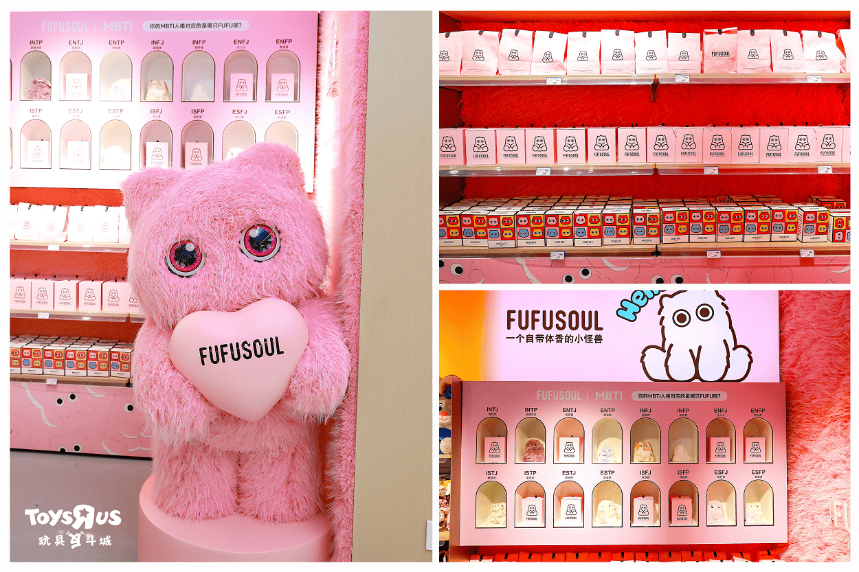 FUFUSOUL也于此打造了品牌特装店,构建了一个融合香氛嗅觉与毛绒艺术的治愈空间。独特的MBTI人格叙事化陈列,将自带体香的小怪兽们对应16型人格,邀请玩家探索“你的MBTI是哪只FUFU”,开启一场充满共鸣的寻香之旅。店内更设打卡墙,半人高粉红小怪兽在粉色毛绒墙前静候粉丝合影。整个开放式区域被柔软毛绒包裹,与专属香氛交织,共同营造出一场唤醒视觉、触觉与嗅觉的多维感官的治愈之旅。