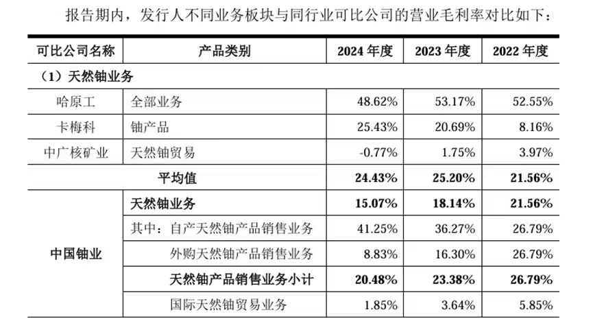 两方因素影响下,该公司天然铀业务合计毛利率自2022年的21.56%下降至2024年的15.07%。