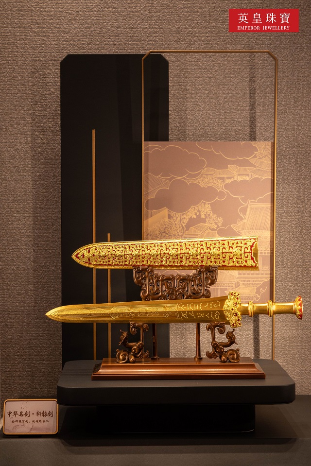 「圣道轩辕」典藏摆件归属「金生世艺·十大名剑」系列,英皇珠宝为此次展出特意重金打造15公斤黄金版本,采用古法手工錾刻结合珐琅彩工艺匠心打造,千年皇家工艺与现代设计美学熔铸于一剑,古法黄金工艺就此焕活新生。「圣道轩辕」的设计更承载着华夏人文对圣贤正统与文明精神的情感共鸣,折射出英皇珠宝在艺术珠宝中实现着对古法工艺和时代精神的高度融合。