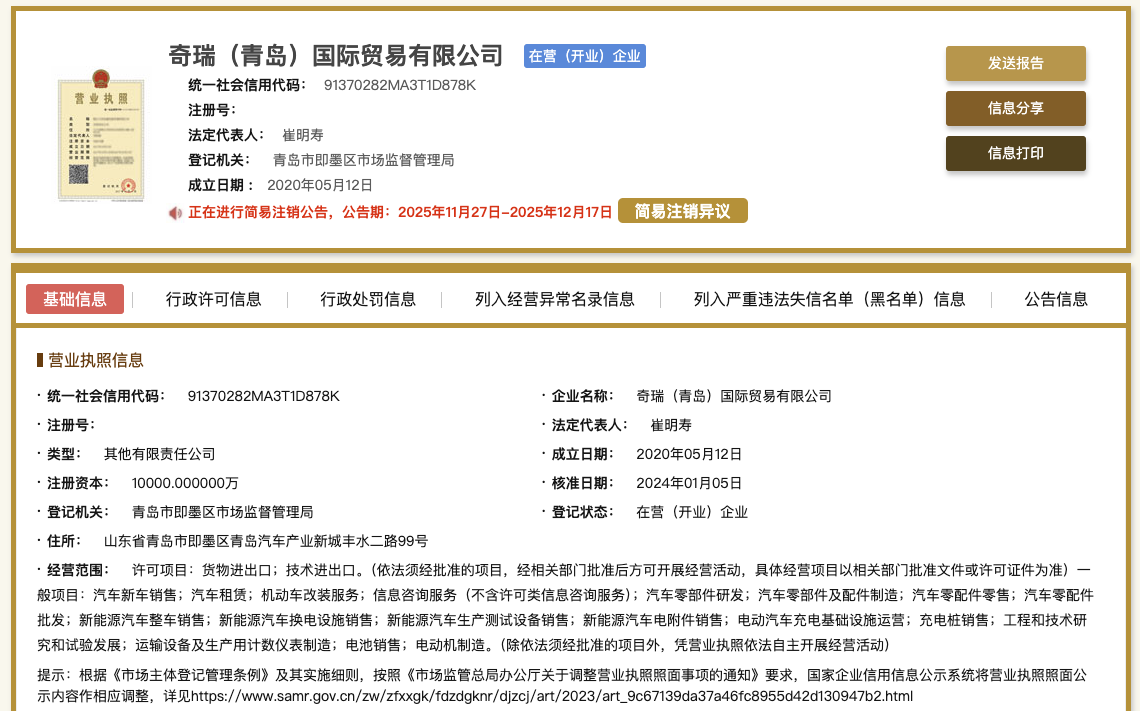 12月3日,国家企业信用信息公示系统网站显示,奇瑞(青岛)国际贸易有限公司新增一则简易注销公告,公告期为11月27日至12月17日。