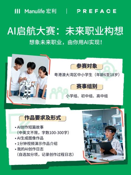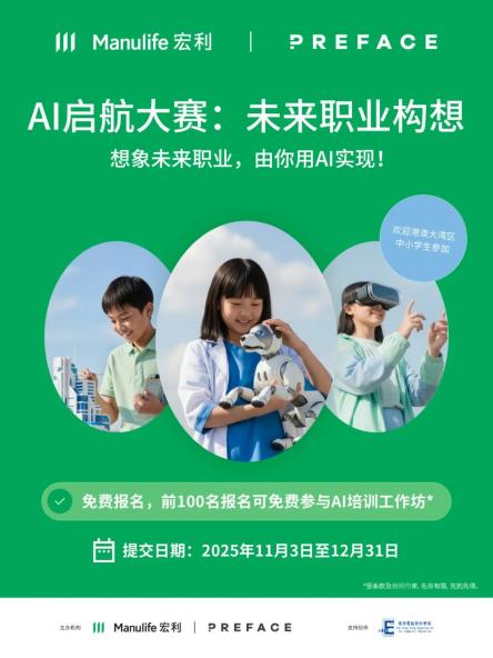 当AI成为重塑世界的核心力量,培育具备科技素养与创新思维的新一代,成为家庭与社会的共识。深耕亚洲超百年的保险巨头宏利,凭借在AI领域的前瞻布局与行业领导力,携手AI教育先驱Preface重磅推出「AI启航大赛:未来职业构想」,为粤港澳大湾区中小学生搭建起探索未来、施展创意的优质平台。这场赛事不仅是孩子们的AI创意竞技场,更全方位彰显了宏利在品牌实力、资源整合与社会责任方面的深厚积淀。