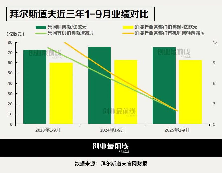 在消费者业务的影响下,拜尔斯道夫集团整体销售额增速也直线下滑,增速从2023年前三季度的11.2%,下滑至2025年同期的2%。