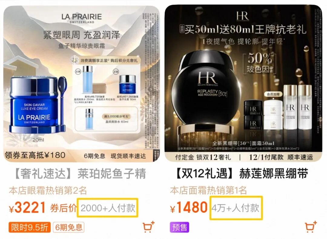 在天猫,莱珀妮最畅销产品鱼子精华眼霜售价3221元/20ml,销量2000+。而赫莲娜销量最高的黑绷带面霜,售价1480元/15ml、3980元/50ml、6380元/100ml不等,销量4万+,是莱珀妮的20倍。