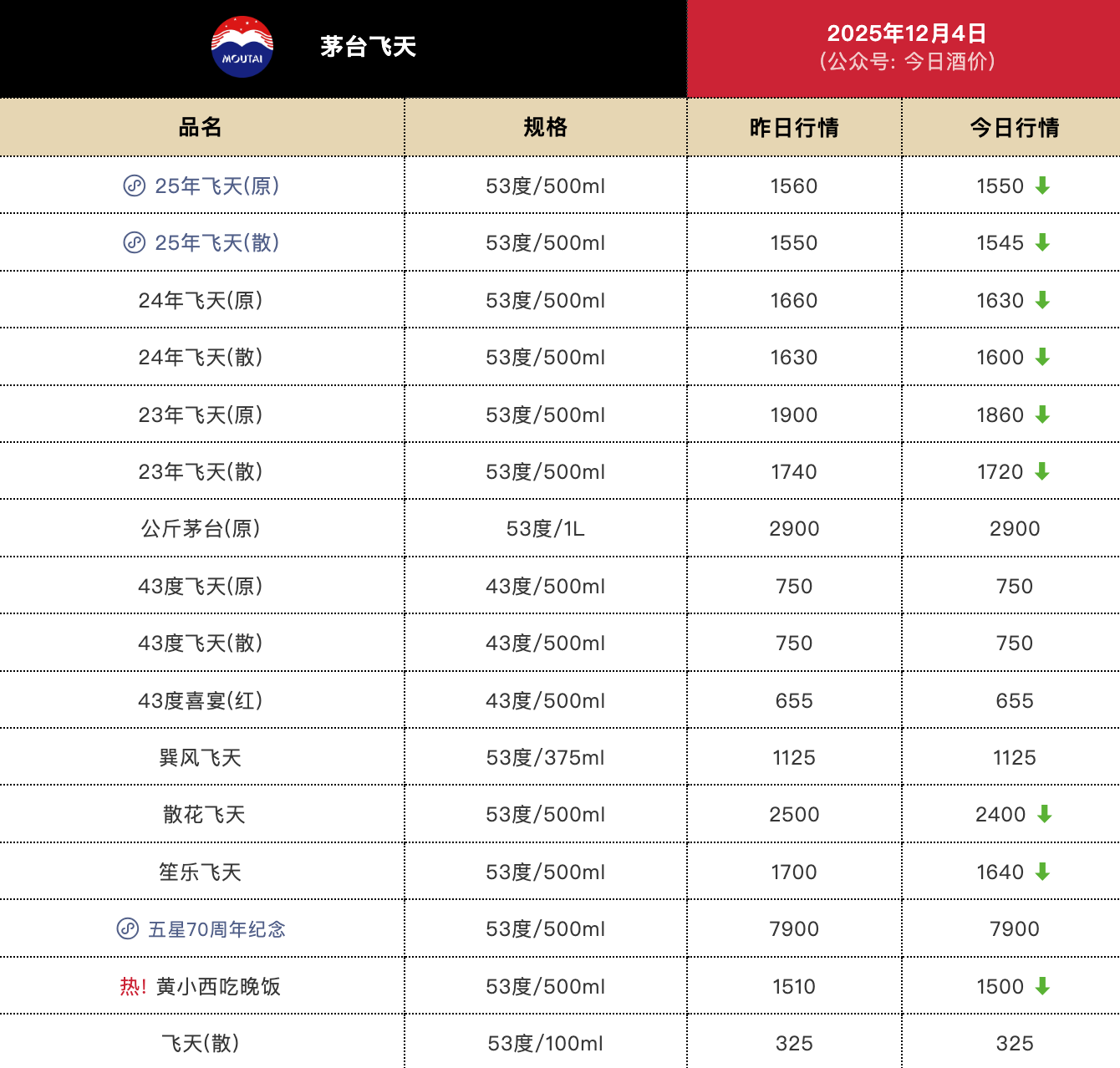今日酒价披露的批发参考价显示,12月4日,25年飞天茅台原箱较前一日下跌10元,报1550元/瓶;25年飞天茅台散瓶较前一日下跌5元,报1545元/瓶。24年飞天茅台原箱较前一日下跌30元,报1630元/瓶;24年飞天茅台散瓶较前一日下跌30元,报1600元/瓶。23年飞天茅台原箱较前一日下跌40元,报1860元/瓶;23年飞天茅台散瓶较前一日下跌20元,报1720元/瓶。