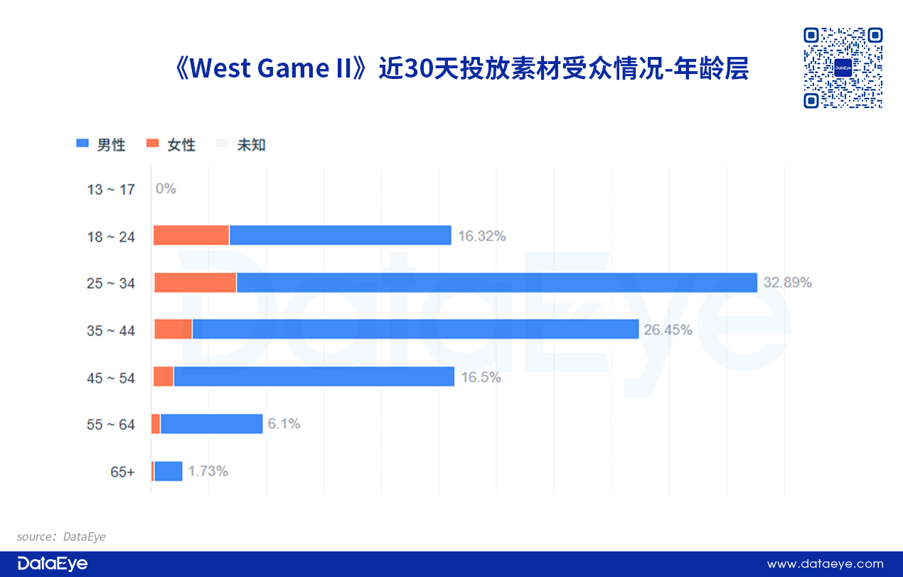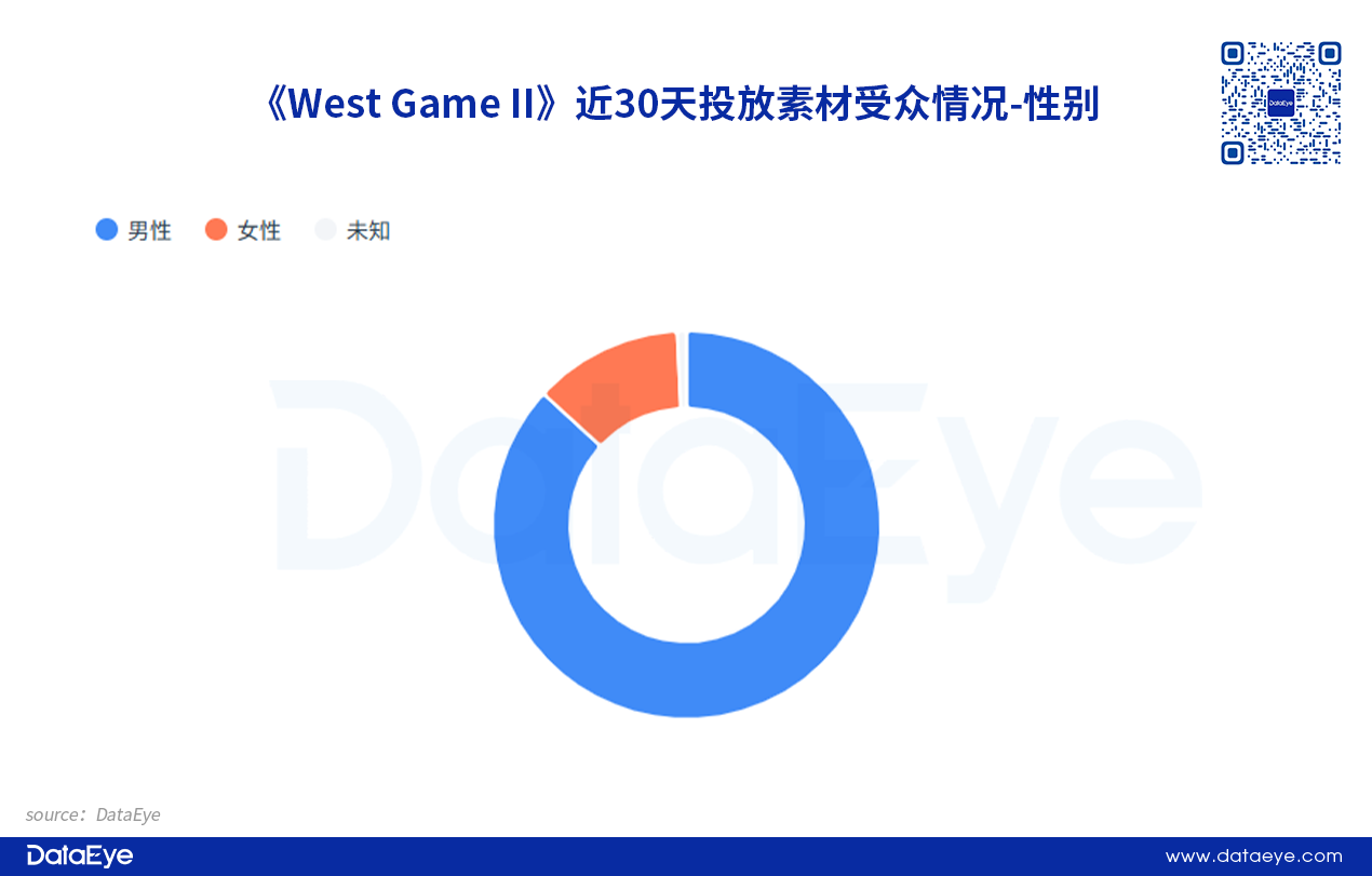 DataEye-ADX海外版数据显示,《West Game II》近30天投放素材的目标受众中,男性用户占比更多,约为86%,而女性用户占比约为14%。西部牛仔题材主要吸引男性玩家的关注。