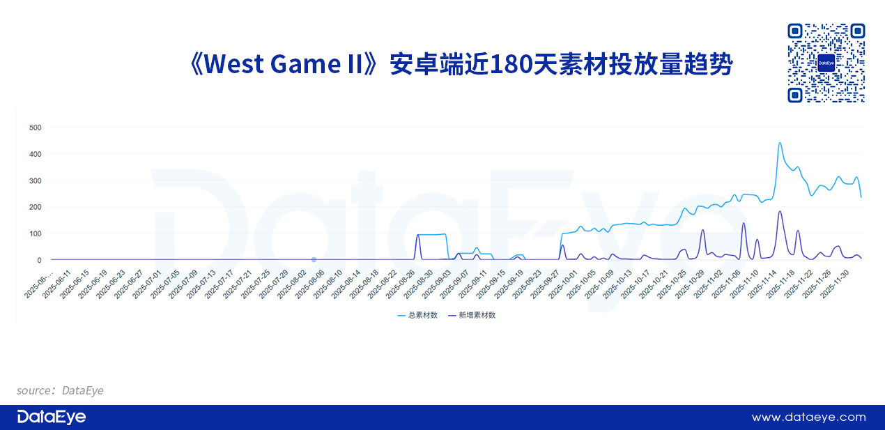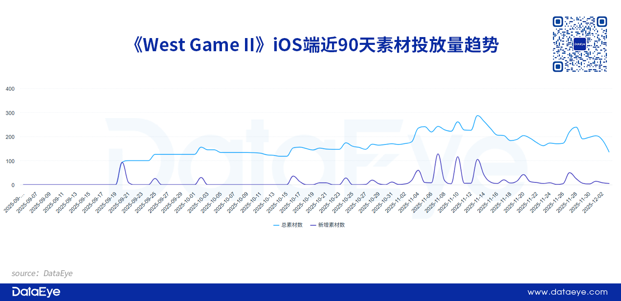 11月13日,《West Game II》iOS端达到投放峰值,单日投放素材量超过300条。而后整体投放量有所下滑,但日均投放素材量仍超过200条。