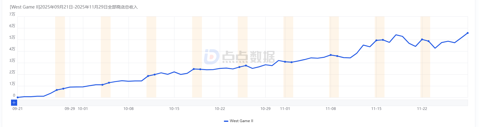 截至11月30日,《West Game II》上线以来双端累计预估收入接近200万美元,约合人民币1400万元。从预估收入趋势来看,《West Game II》收入数据呈现持续攀升的态势。