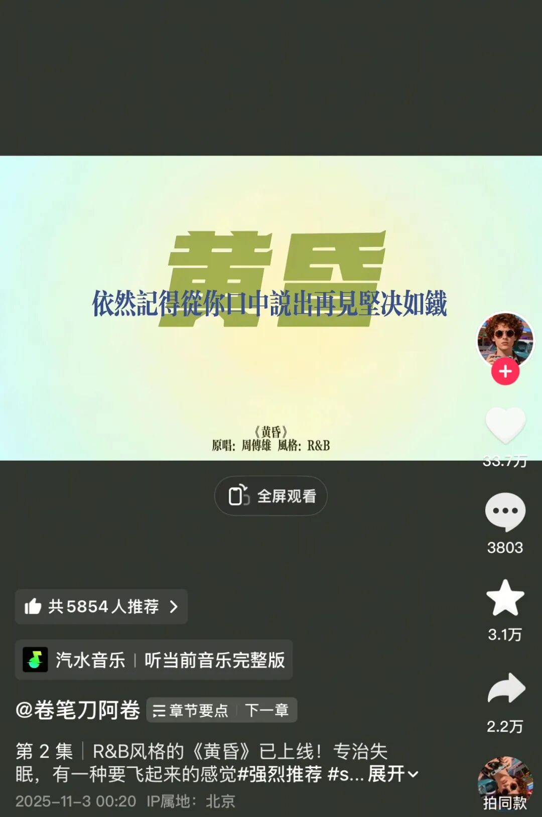 但AI歌手的弱点也在于太完美,不少人批评大头针听多了审美疲劳。这一点,不爱飙高音的“卷笔刀”就做了很好的补位,他以一首《黄昏》引爆短视频,是在周传雄声线基础上的极致温柔。声音丝滑没有半分凝滞,像是刚做完雾化吃了二斤枇杷膏就来录制。