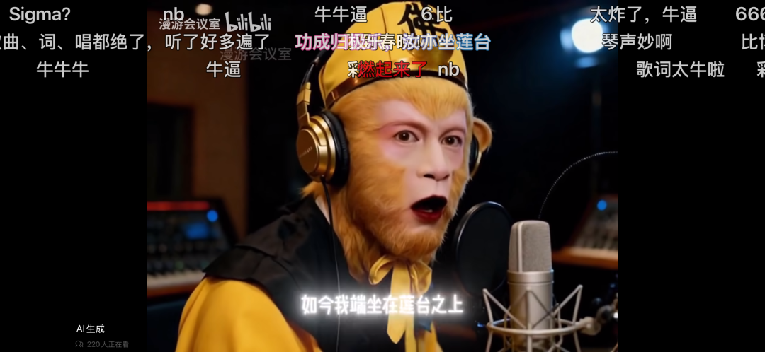 这个问题也被AI解决了,不用太复杂让“本尊”上就行。在B站,人们用AI为《西游记》人物写专属主题曲,白骨精的《不再三》、孙悟空的《美猴亡》、银角大王的《装装样》堪称AI判词。这种AI作词作曲并利用原角色形象进行演唱的形式,让受众有了更强沉浸感。就像影视解说改成第一人称,用AI模拟主角音色进行讲解一样,带来的变革不言而喻。