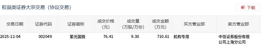 12月4日,紫光国微大宗交易成交9.3万股,成交额710.61万元,占当日总成交额的0.94%,成交价76.41元,较市场收盘价76.41元持平。