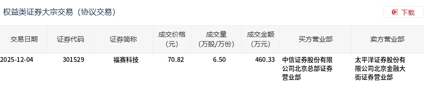 12月4日,福赛科技大宗交易成交6.5万股,成交额460.33万元,占当日总成交额的1.19%,成交价70.82元,较市场收盘价71.54元折价1.01%。