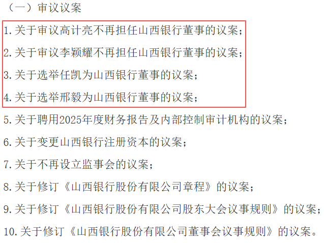 第1项、第3项与董事长变更有关,审议高计亮不再担任董事、选举任凯为董事的议案。2021年4月,原晋商银行副行长高计亮获准担任山西银行的首任董事长,领导完成对大同银行等5家银行在内的整合工作,在位时间4年半,如今年满60周岁,已到退休年龄。