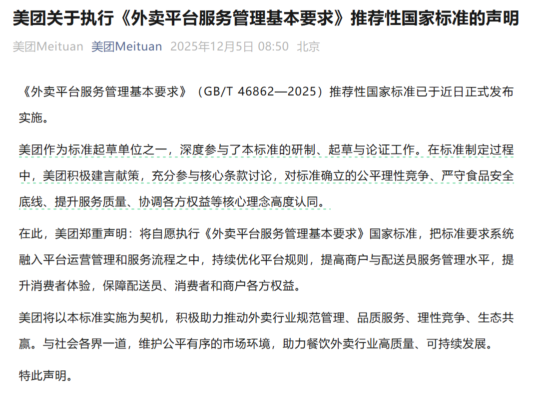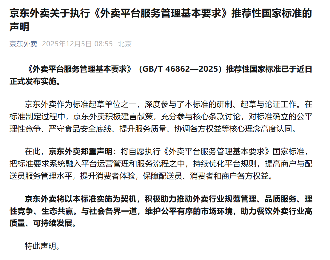 截至12月5日,京东外卖、美团、淘宝闪购均发布关于执行《外卖平台服务管理基本要求》推荐性国家标准的声明,表示将自愿执行《外卖平台服务管理基本要求》国家标准,把标准要求系统融入平台运营管理和服务流程之中,持续优化平台规则,提高商户与配送员服务管理水平,提升消费者体验,保障配送员、消费者和商户各方权益。