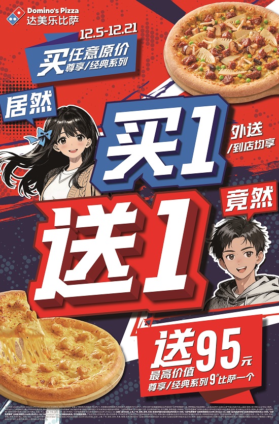 *“买一送一“活动规则:活动时间:2025年12月5日-2025年12月21日,10:00-22:00。活动期间,原价购买任意9"或者12"尊享系列/经典系列比萨1个,可获赠任意尊享系列/经典系列/超值系列9"比萨1个,获赠价值不高于购买比萨产品原价,可在本单中选择直接赠送比萨或获得“比萨免费赠券”1张,两种赠品只能选择其一。“比萨免费赠券”有效期至2026年1月4日21:59;“比萨免费赠券”为赠品,到期自动失效,不可延期或退款。此活动适用于达美乐比萨中国大陆官方线上渠道(官网、官方微信公众号及小程序、官方APP),不与其他优惠同享。部分门店营业结束时间延长至24:00的,比萨免费赠券”有效期至2026年1月4日23:59,具体门店营业时间信息请以达美乐比萨中国大陆官方网上订餐渠道页面显示及电话订餐渠道反馈为准。