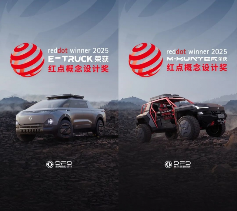 在2025年红点奖获奖的汽车案例中,多款产品展现了松柏服务的成果。比如东风汽车旗下两款概念车概念皮卡E-TRUCK、东风猛士M-HUNTER,二投二中,其中E-TRUCK更是斩获红点最佳设计奖(Best of the Best),松柏申奖助力东风汽车从前期的评估规划到后期材料打磨,将东风汽车成功送上了红点奖至尊奖的国际舞台。这些获奖作品无一不彰显着松柏在材料选择、设计创新和市场定位方面的专业指导能力。