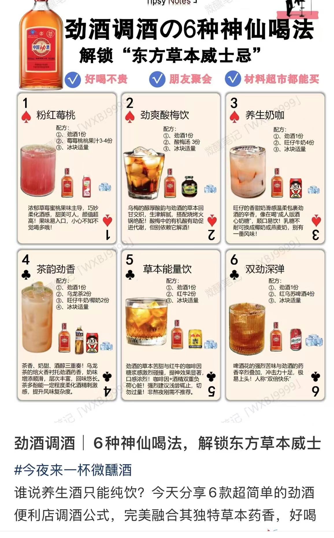10多块钱一瓶的红标劲酒近年被称为“便宜大碗的国产威士忌”,还衍生出“劲酒 + 红牛 ”“劲酒 + 冰红茶 ”等调酒配方。界面新闻记者查询社交平台发现,劲酒特调新配方层出不穷,包括搭配果汁、碳酸饮料、红糖姜茶等五花八门的种类。