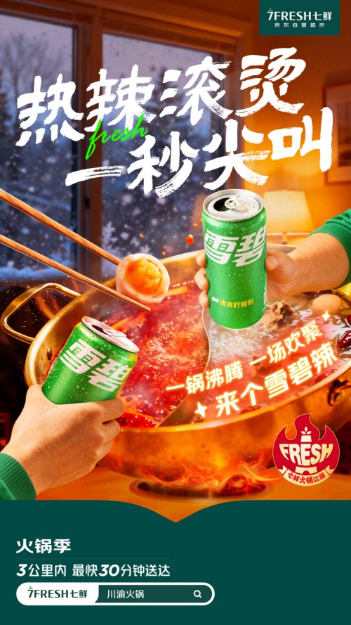 这场合作的底层逻辑,直指火锅场景的核心情绪。火锅不仅是美食,更是酣畅淋漓的社交与释放。滚烫麻辣带来灼热快感,一罐雪碧入口后,恰到好处平息舌尖的灼热,形成一种绝妙的感官平衡。这种从口腔直达神经的“雪碧配辣锅,一口爽入魂”,正是京东七鲜与雪碧希望创造的体验——不止于解辣,更是一种情绪的提亮与升华,将一顿火锅升级为完整的畅爽仪式。