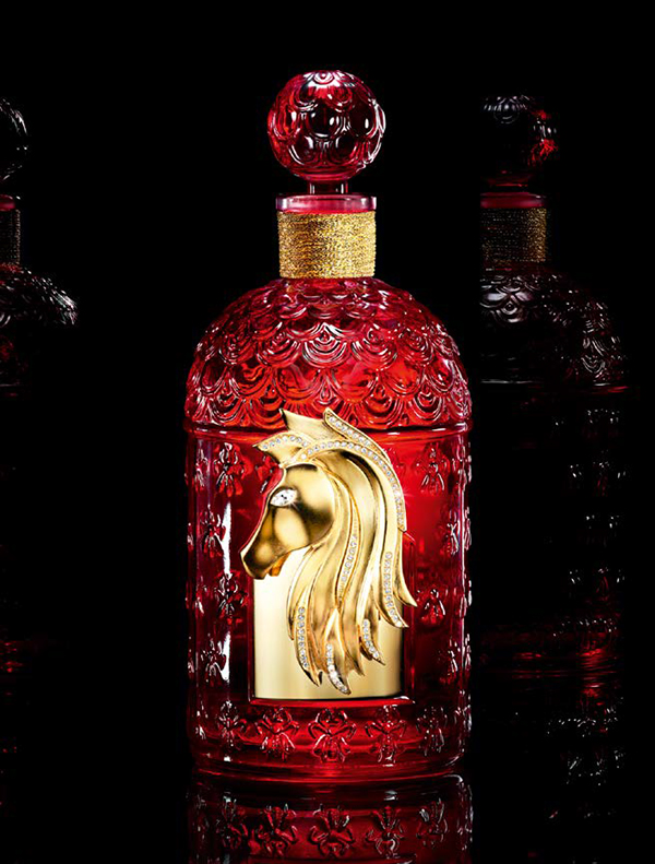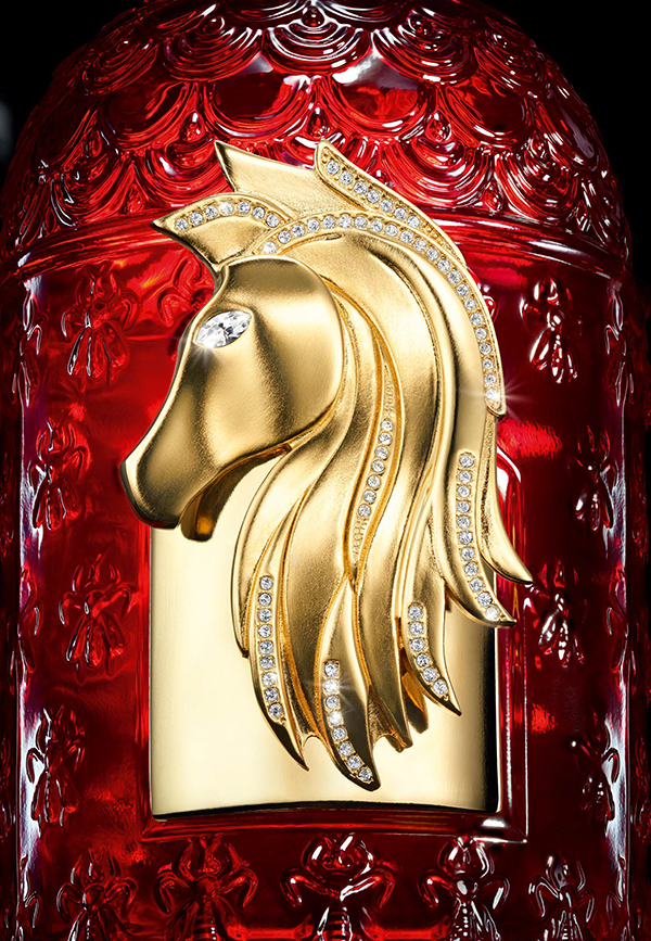 光彩夺目的镀金骏首精心镶嵌 79 颗施华洛世奇水晶,华丽装饰蜂印瓶独具特色的修长外观,欢庆中国新春佳节。切割成杏仁形状的水晶为骐骥点睛,78 颗圆形水晶则沿着马鬃线条次第铺陈。