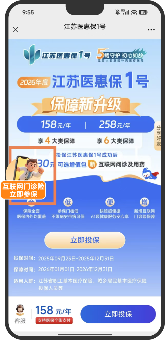 微信搜索“江苏医惠保1号”公众号,进入菜单栏点击“立即投保”,投保2026年度“江苏医惠保1号”后,点击投保页面左侧悬浮窗了解保障详情,以微信支付方式额外添加购买,价格30元/人/年。