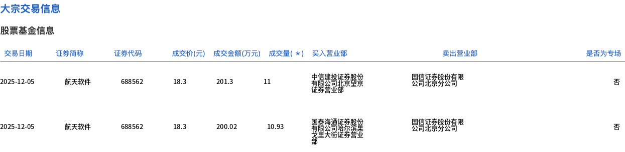 12月5日,航天软件大宗交易成交21.93万股,成交额401.32万元,占当日总成交额的0.86%,成交价18.3元,较市场收盘价21.06元折价13.11%。