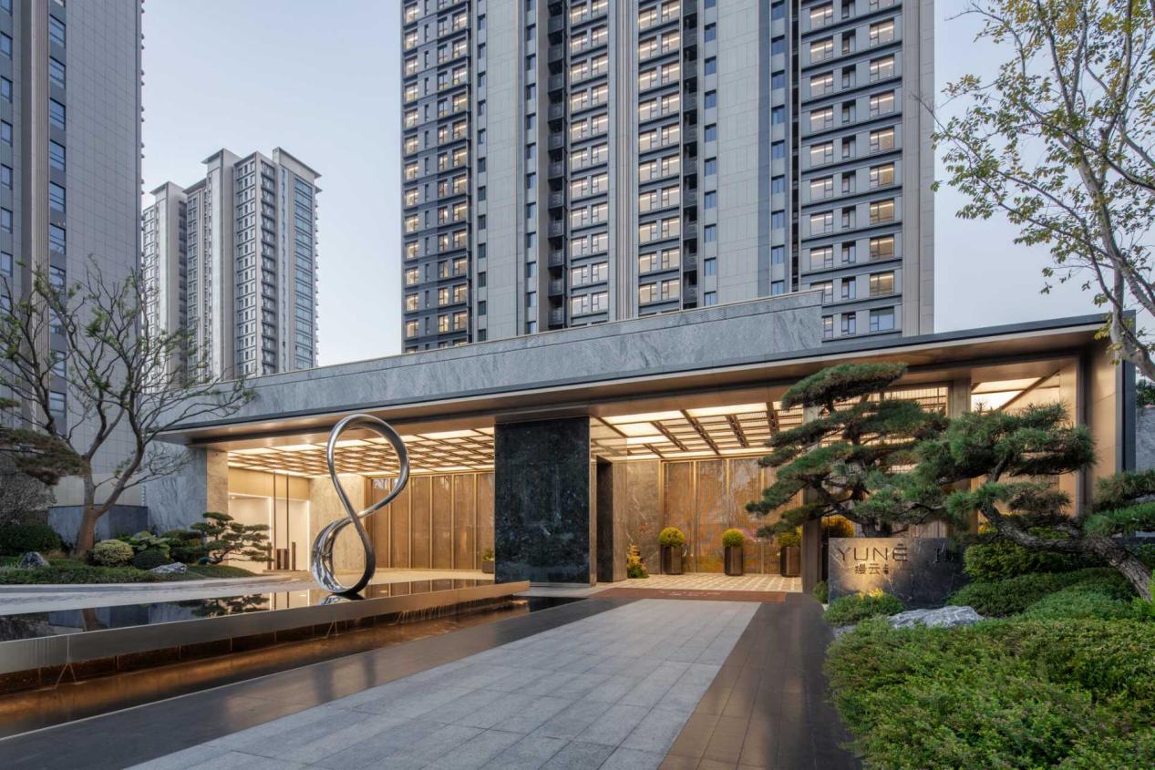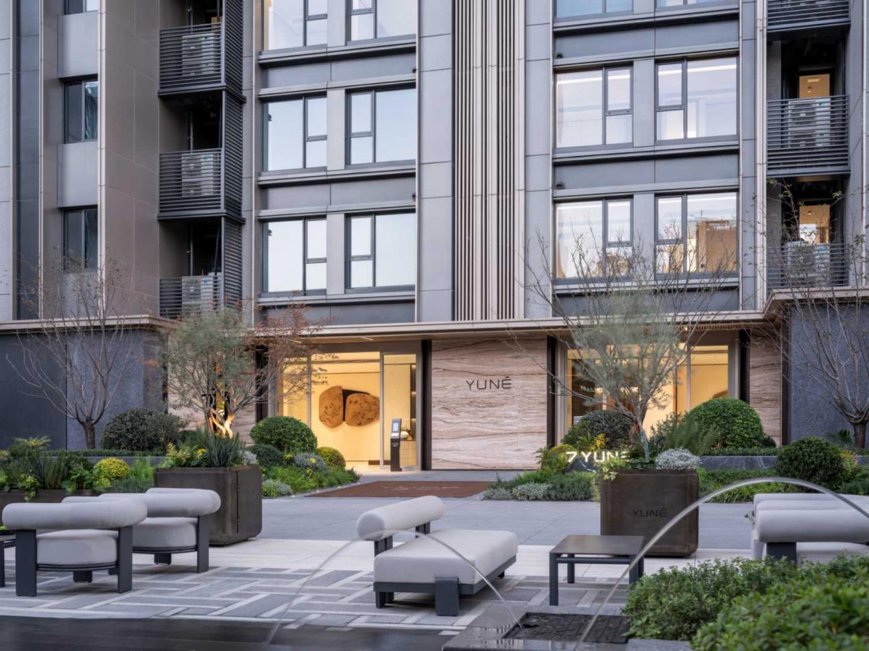 一期实景呈现,带给杨浦滨江一种全新的国际化生活氛围。建筑立面采用大面积铝板、香槟金属边框与玻璃幕墙,在刚柔并济的几何韵律中,勾勒出历久弥新的现代城市天际线;景观营造更是以百年黑松、朴树与红枫构成季相丰富的林木序列,融合灵动水景,形成步移景异的自然体验;精心规划的泛会所,涵盖茶室、书吧、共享办公、四点半学堂、儿童区和钢琴房等功能,以“一场景一功能”的理念,成为促进邻里交互的“社区客厅”;参照五星级酒店标准打造的地库,以星空顶、水磨石地面营造归家尊崇感。