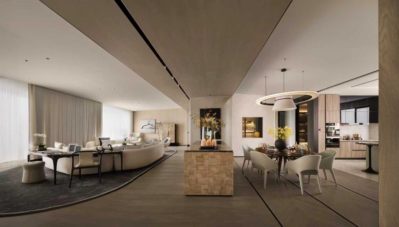在这里,空间不再被功能定义。“4+1房三厅五卫”的格局,实现了功能与美学的卓越平衡;10米面宽与3.5米层高,配合全景落地窗,将约3.5万平方米的折叠园林化为动态窗景。当晨光穿透玻璃倾泻而入,客厅、餐厅、厨房与阳台的界限在光影中悄然消融,创造出真正意义上的“LDKB一体化”社交场域。既能承载商务宴请的仪式感,也能容纳三代同堂的温馨日常,或是演变为家庭图书馆、私人影院、亲子游乐区。它精准回应了高净值家庭从“居住空间”向“生活场域”的价值转向——家,应是能随生命阶段自由生长的容器。