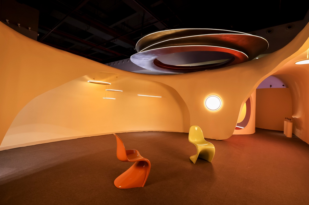 展台以“宇宙虫洞”为形体基础,整体呈现柔和流动的曲面结构,光线沿曲面内外流转,营造出能量穿越时空的视觉效果。中央设置的“时空之环”以线性光织就,象征时间的中轴,串联起空间的延展与观者的感知路径。欧普照明产品被有机嵌入这一建筑语境中,成为光影叙事的一部分。“光”作为建筑元素的可能性,重新诠释着其在空间中的无限可能。