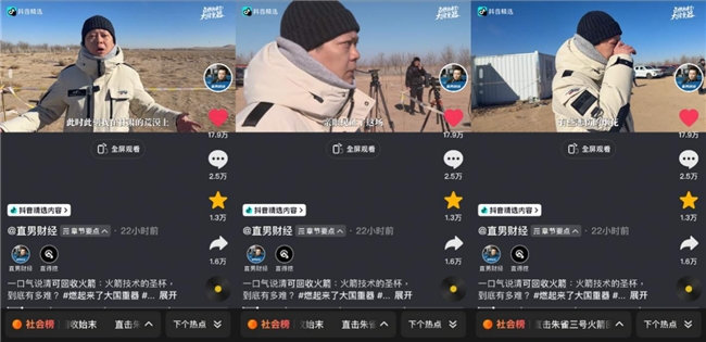 近日,中国首枚正式发射的轨道级可回收运载火箭升空,二级火箭成功进入预定轨道,一级火箭回收失败。抖音精选创作者 @直男财经,获得近距离独家观测发射的机会,成为唯一来到现场的自媒体,并发布的多部朱雀三号科普视频,收获百万网友围观。