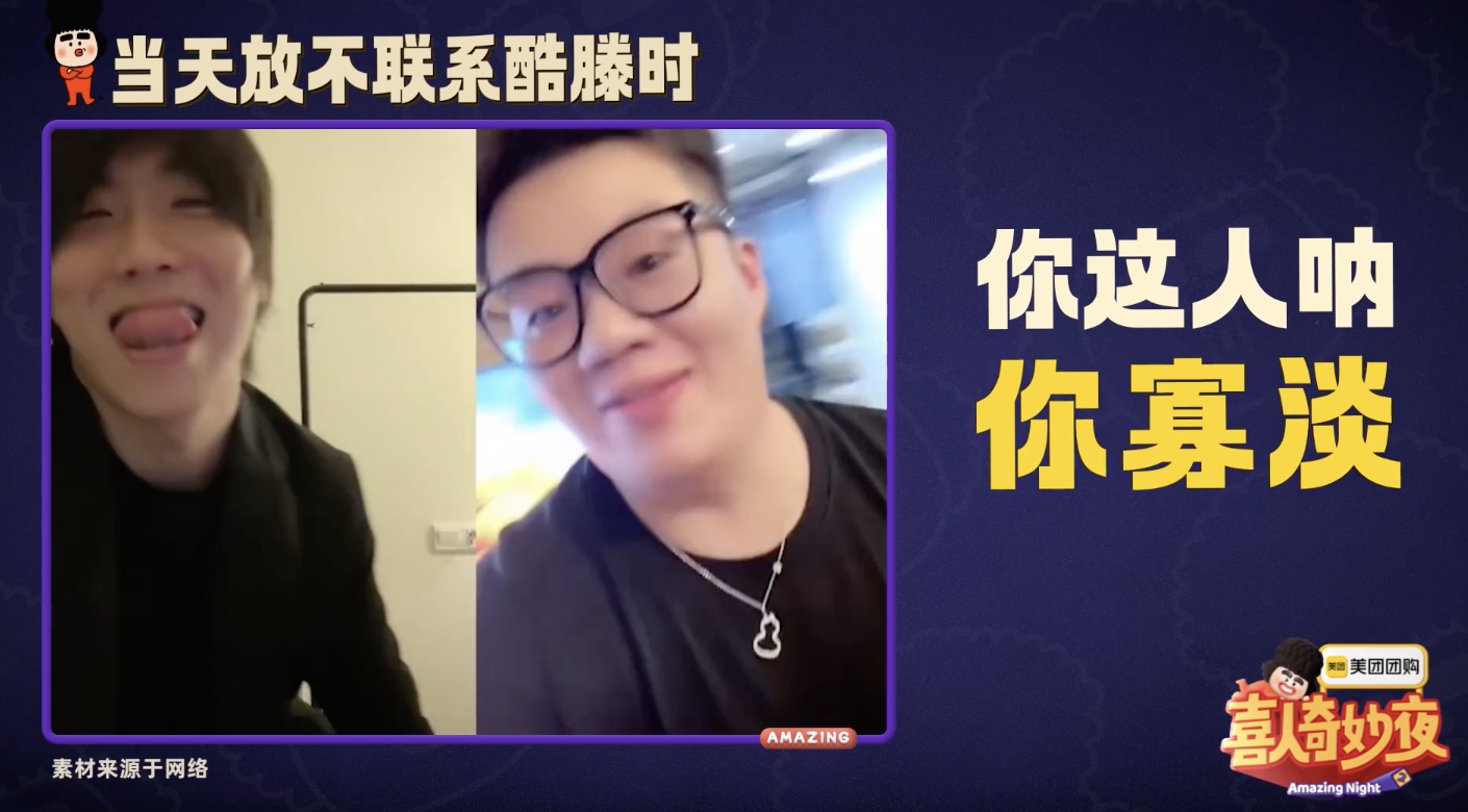 酷滕和天放的直播有个经典段落在互联网广为流传:联系不上天放的酷滕在直播间痛骂他“寡淡”。总决赛现场,李诞点评酷滕时说,“我觉得不是天放寡淡,是你这个人太浓烈了,可能我们所有人对你来说都有点寡淡。”