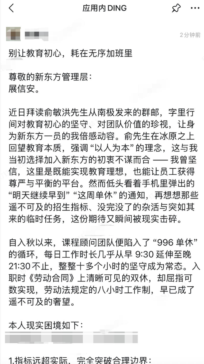 事情源于12月4日,新东方杭州一名课程顾问在内部群向全员发送了一篇题为《别让教育初心,耗在无序加班里》的公开信。该员工在信中表示,自己曾被俞敏洪信中 “坚守教育本质”“鼓励公开吐槽” 的表述打动,但现实工作却陷入 “996单休” 的恶性循环。每日工作时长从早9:30延伸至晚21:30以上,劳动合同约定的双休几乎无法实现,八小时工作制成为奢望。