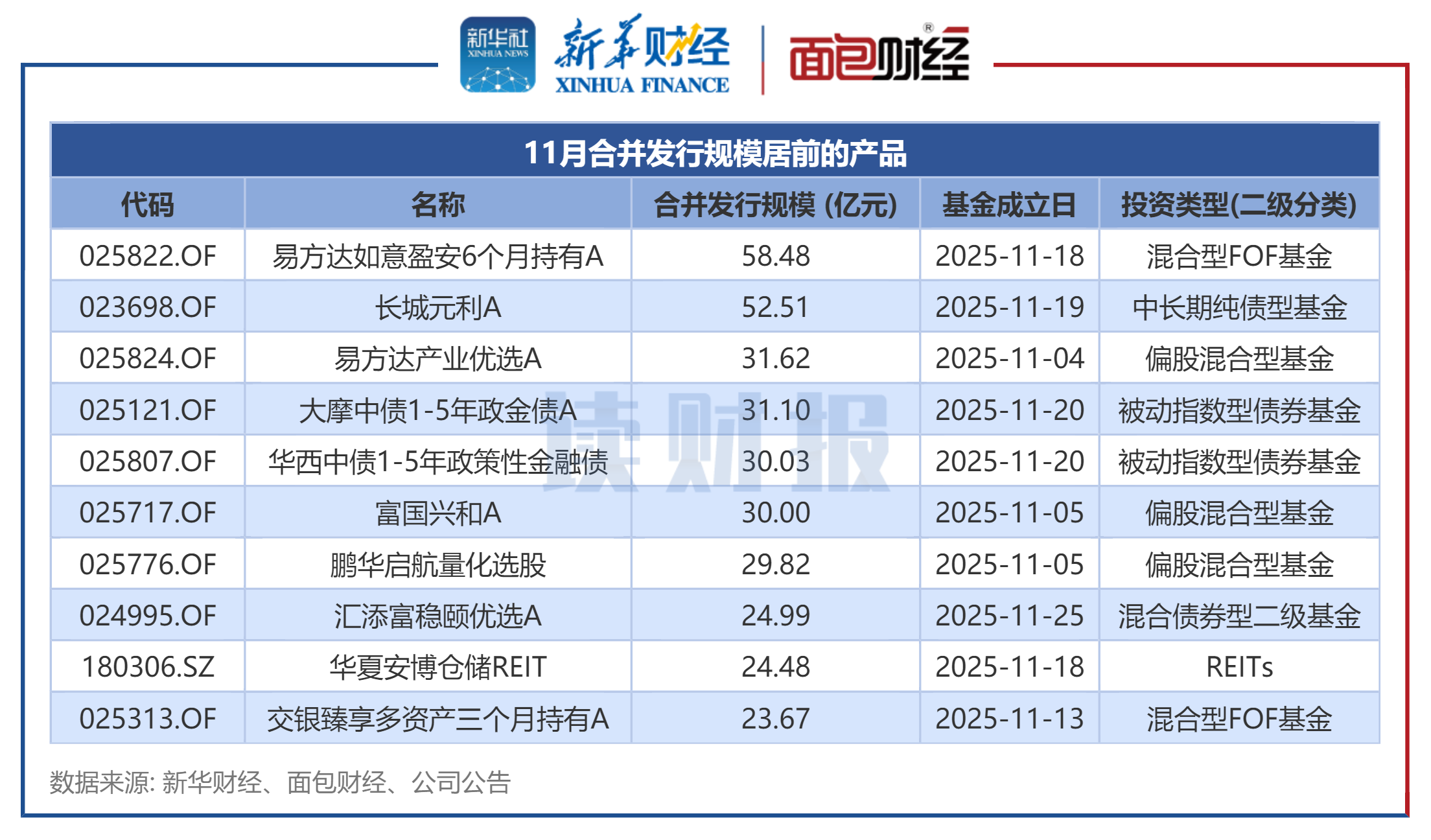 具体来看,11月合并发行规模最大的产品为易方达如意盈安6个月持有。该基金于11月19日发布公告称,基金有效认购户数为24688户,基金合同于11月18日正式生效。该基金类型为偏债混合型FOF基金,基金经理为张振琪,合并发行规模为58.48亿元。