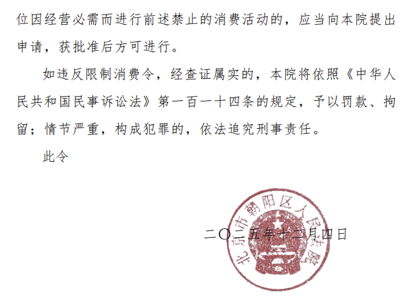 中国执行信息公开网显示,12月4日,伯喜(北京)文化传媒有限公司及其法定代表人刘光耀新增一则限制消费令,涉及股东知情权纠纷案件,申请人为刘光耀前妻安吉,执行法院为北京市朝阳区人民法院。