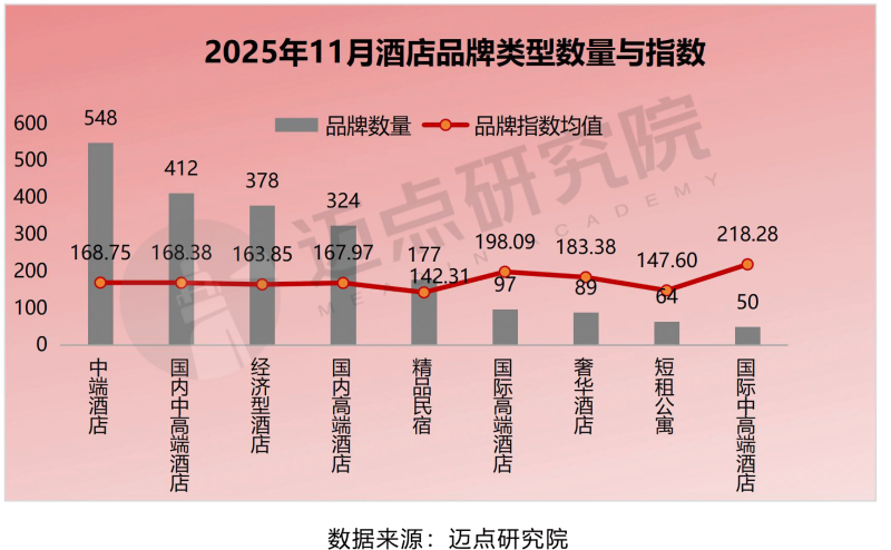 1、据迈点研究院统计,11月各类型酒店品牌市场呈现“高端崛起、大众回调”的显著分化态势。高端及国际型品牌表现亮眼,成为市场核心增长引擎。大众消费型品牌则面临阶段性压力。这一趋势与行业“从规模扩张转向价值深耕”的变革方向高度契合,国际品牌凭借成熟的运营体系与品牌溢价能力,在淡季中展现出更强的价格韧性。