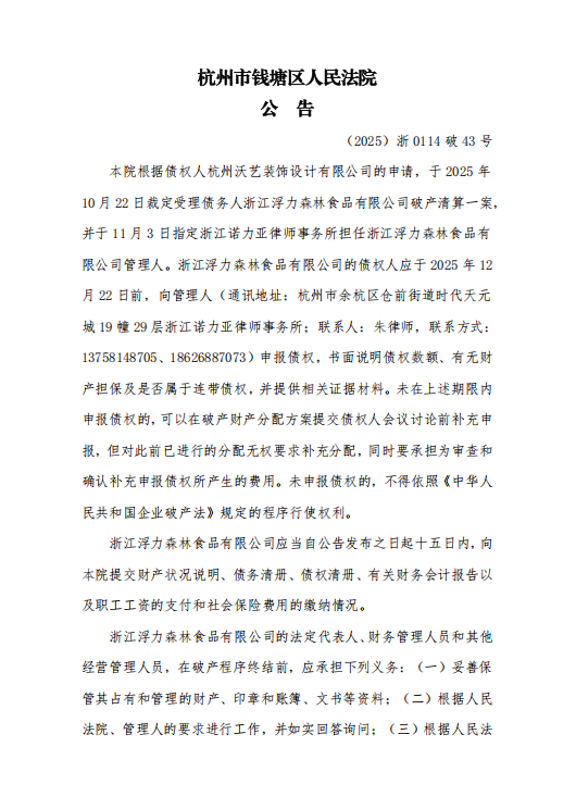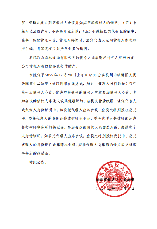 12月8日,浮力森林发布破产公告。其中提到,杭州市钱塘区人民法院于2025年10月22日裁定浙江浮力森林食品有限公司破产清算一案。法院定于2025年12月29日上午9时30分在杭州市钱塘区人民法院第十二法庭(或以网络在线方式,届时由管理人另行通知)召开第一次债权人会议。