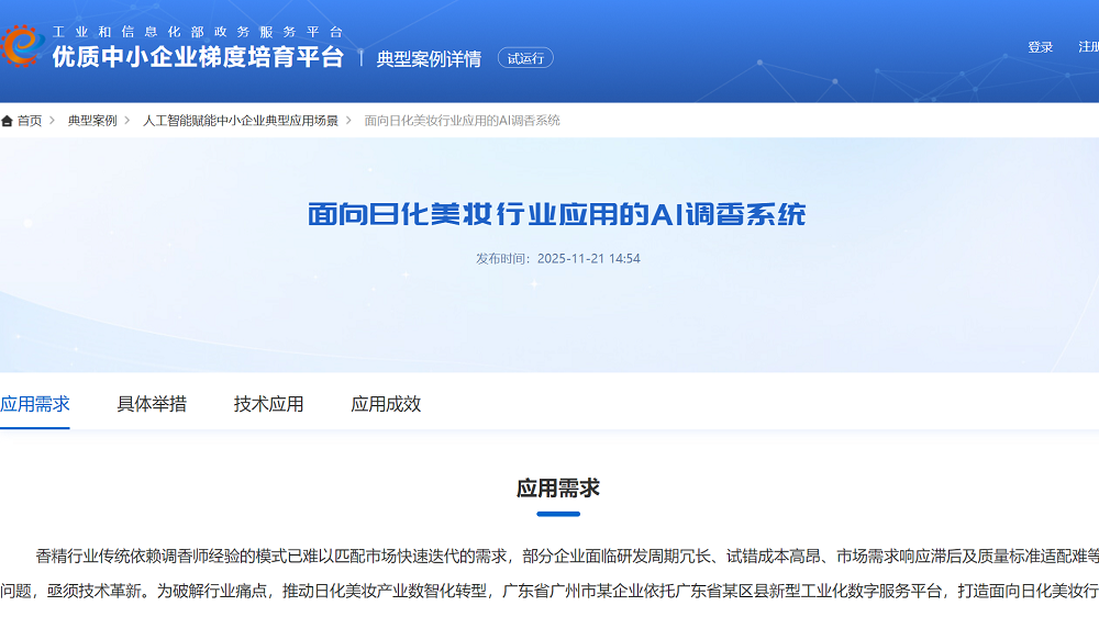 近日,工信部公示2025年度人工智能赋能中小企业典型应用场景,广州市花都区"面向日化美妆行业应用的AI调香系统"案例成功入选,成为全国238个典型场景之一。花都区新型工业化数字服务平台为该系统的开发和应用提供了重要支撑。针对中小企业在数字化转型过程中普遍存在的"不想转、不敢转、不会转"难题,花都区政府联合华为、之云科技等机构搭建了这一平台,通过提供全方位的数字化服务,助力企业实现转型升级。此次AI调香系统案例的入选,充分证明了平台在赋能中小企业数字化转型中的显著成效。