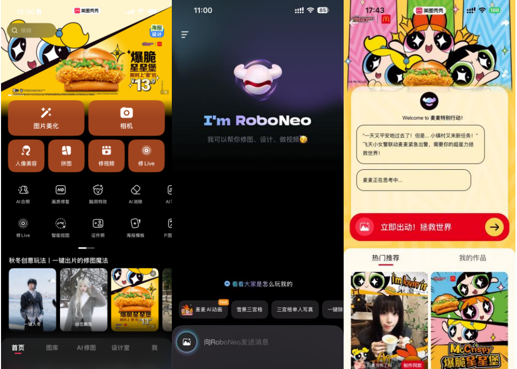 当快餐巨头的潮流新品遇上影像赛道的AI创新,会碰撞出怎样的火花?12月3日,美图与麦当劳联手以AI Agent打造营销新玩法,借助美图旗下RoboNeo的技术能力,围绕麦当劳新品“爆脆星星系列”,推出可对话、可变身、可生成剧情式内容的全新互动,用户在北京、上海、广州、深圳的四家麦当劳餐厅还可参与线下体验。