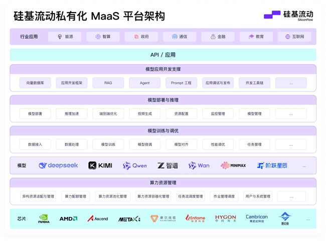 勿在浮沙筑高楼,技术基石必须扎实建设。硅基流动私有化 MaaS 与客户携手,逐一攻克 AI 基建难题,系统性地解决具体问题,助力企业建设一个能够纳管异构算力、加速国产芯片、模型适配快、性能稳定高效、性价比高的模型能力底座平台。