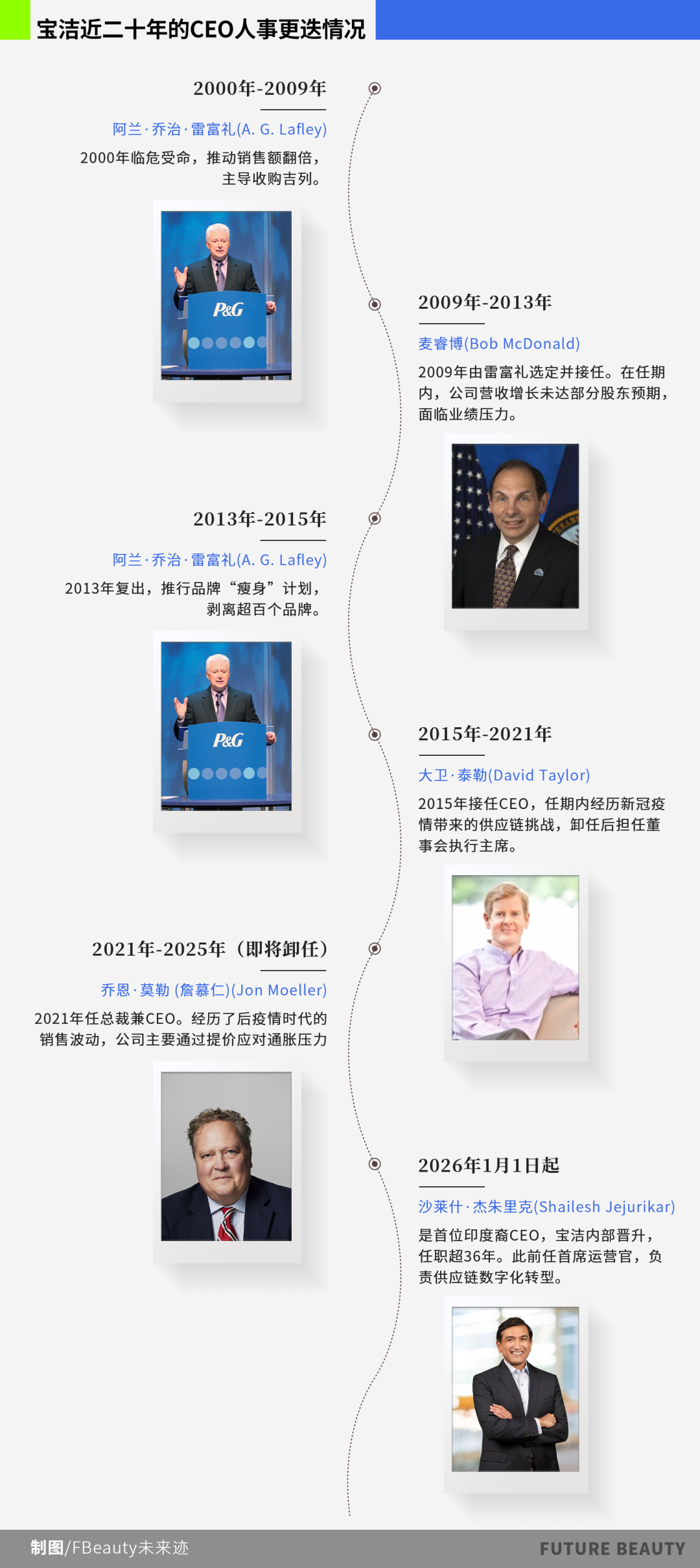 2026年1月1日,在宝洁体系内历练36年、深度参与近年组织与供应链变革的首席运营官Shailesh Jejurikar即将接任,成为宝洁近20年内的第五位“一把手”。