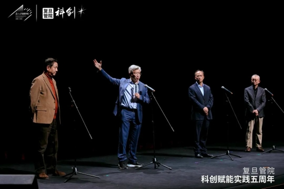 大戏尾声,复旦管院党委书记陆雄文教授、复旦管院科创管理研究中心首席研究员阙波,德同资本董事长、复旦科创企业家营授课老师邵俊,知识产权管理专家、复旦科创企业家营授课老师王雷共同登台,向舞台上的科创人,也向每一位现实中的科创人送上“赋能者说”。