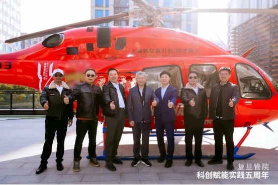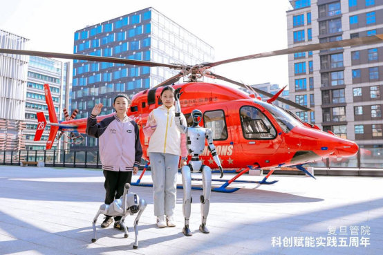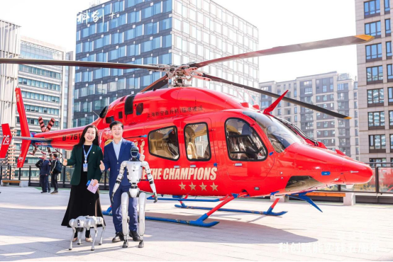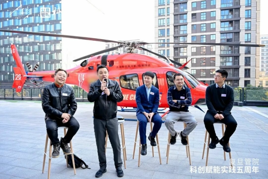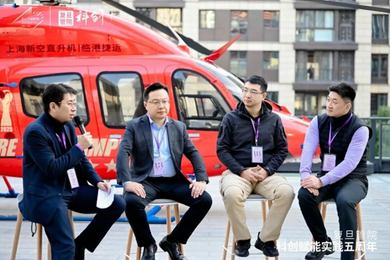 伴随本场论坛嘉宾、上海新空直升机有限公司董事长、新空航空科技(上海)有限公司创始人曹新田带来的直升机“空降”惊喜,“科技智驱专场”在政立院区连廊举行了一场室外分享。