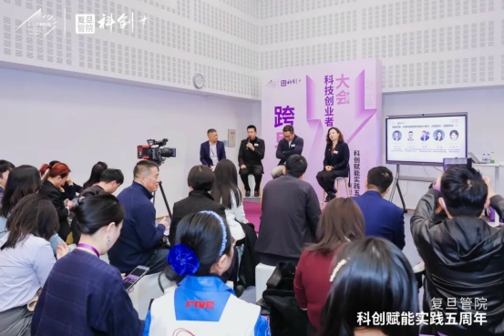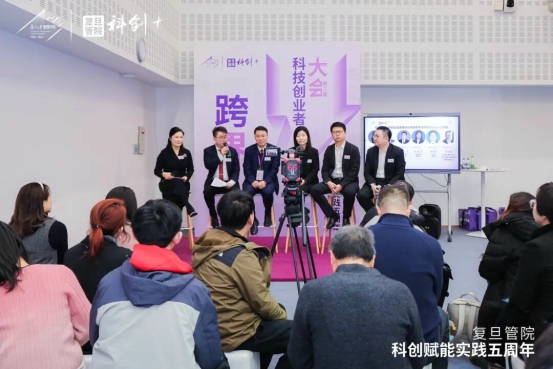 安永中国研究院院长郭毅,复旦管院科创加速中心助理主任刘晨,软馨生物董事长、上海交通大学医学院附属第九人民医院教授、复旦科创企业家营校友周广东,恒驭生物董事长、复旦大学遗传学博士、复旦科创企业家营校友朱向莹,云知声总经理、复旦科创企业家营校友黄盼,安永华明会计师事务所合伙人梁宏斌围绕“科创企业成长性认定与科创企业家身份认同感思考”主题展开深入对话。